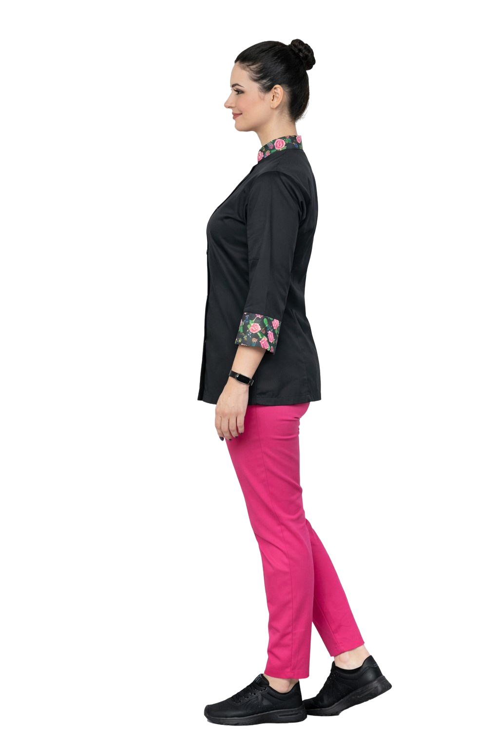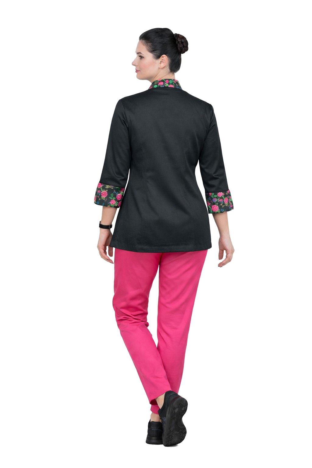 Unikālu raksturu blūzei piešķir ziedu ieliktnes uz apkakles un piedurknēm, kas izgatavotas no 100% kokvilnas, kas smalki uzsvērt sievišķīgo uniformas stilu.