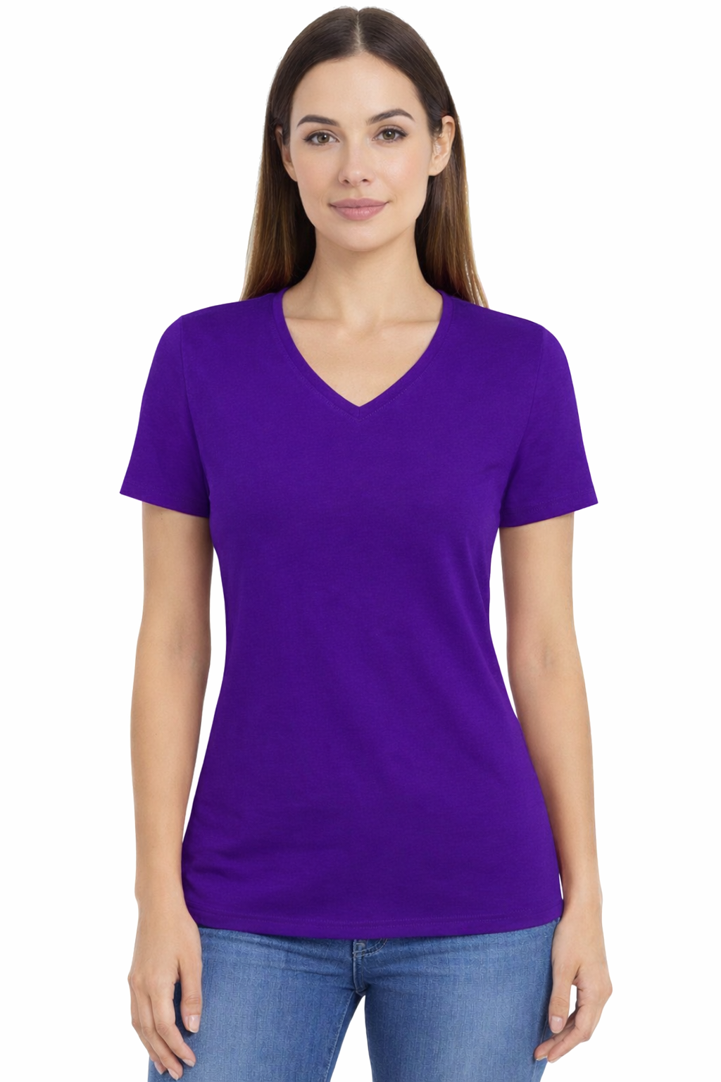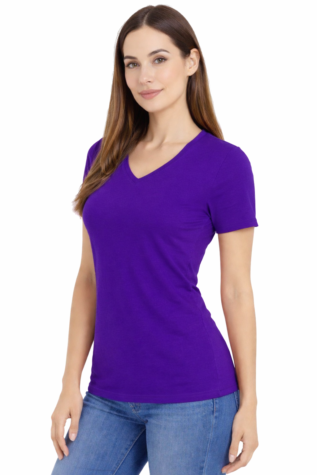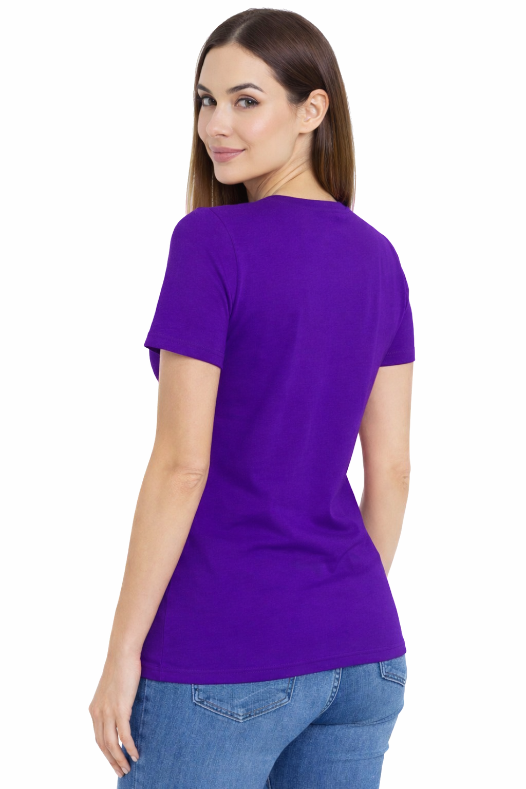 Krekls ar īsām piedurknēm – kokvilnas sieviešu krekls ar "V" formas izgriezumu, purpura krāsā