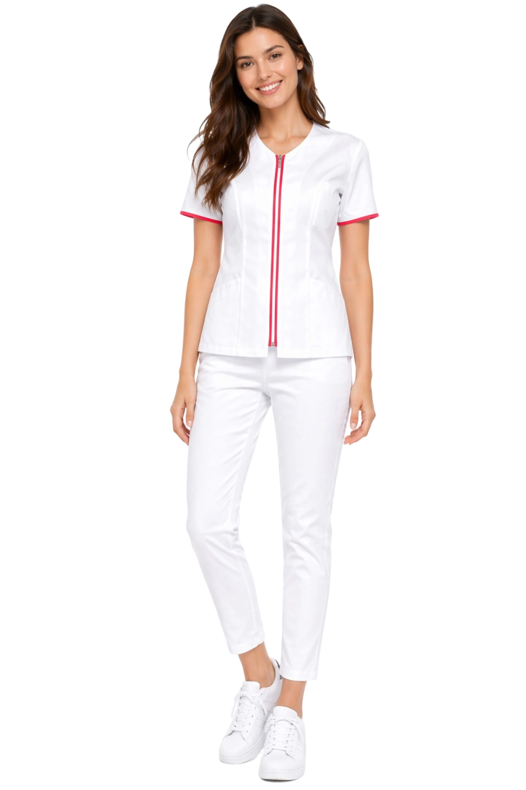 Medicīnas komplekts ar rāvējslēdzēju un cigaretēm ir elegants un funkcionāls medicīnas apģērbu komplekts sievietēm, kuras novērtē profesionālu izskatu un darba ērtumu. Balta žakete ar amarantu aploksni, apvienojot ar balto cigarešu tipa biksēm, veido stilīgu un modernu medicīnas uniformu.