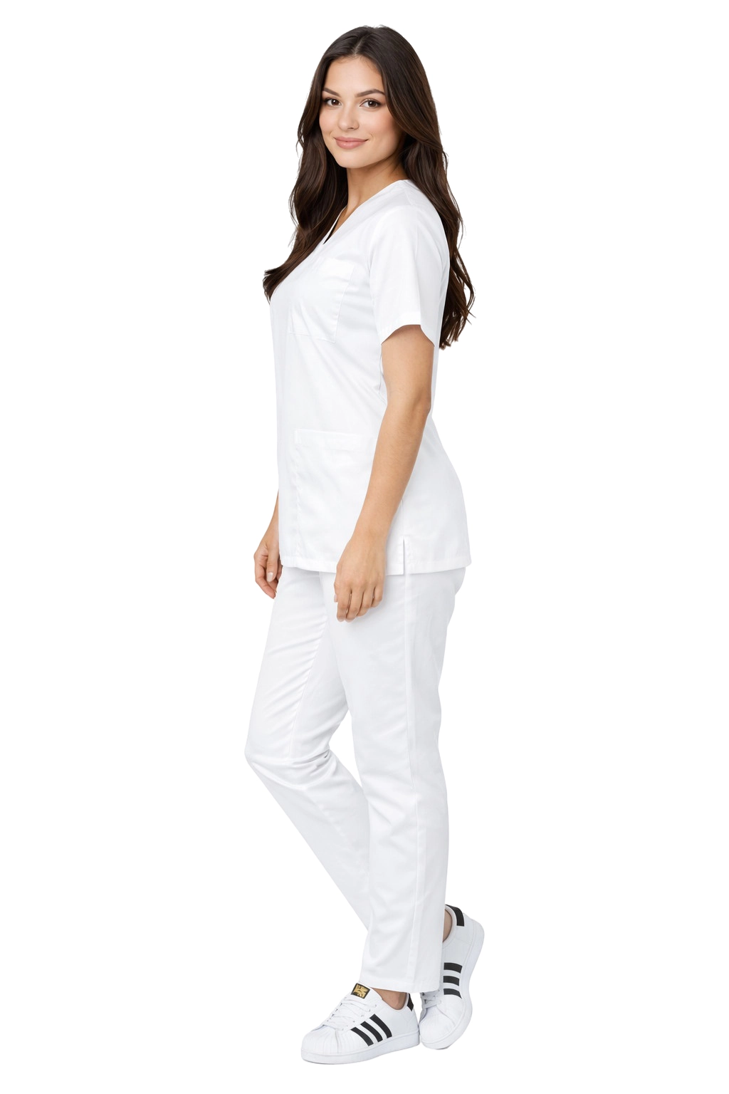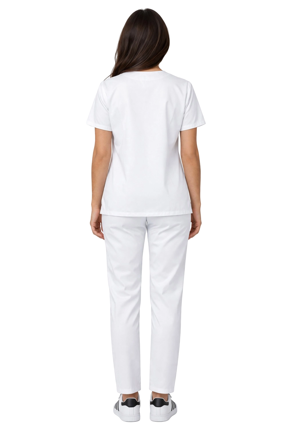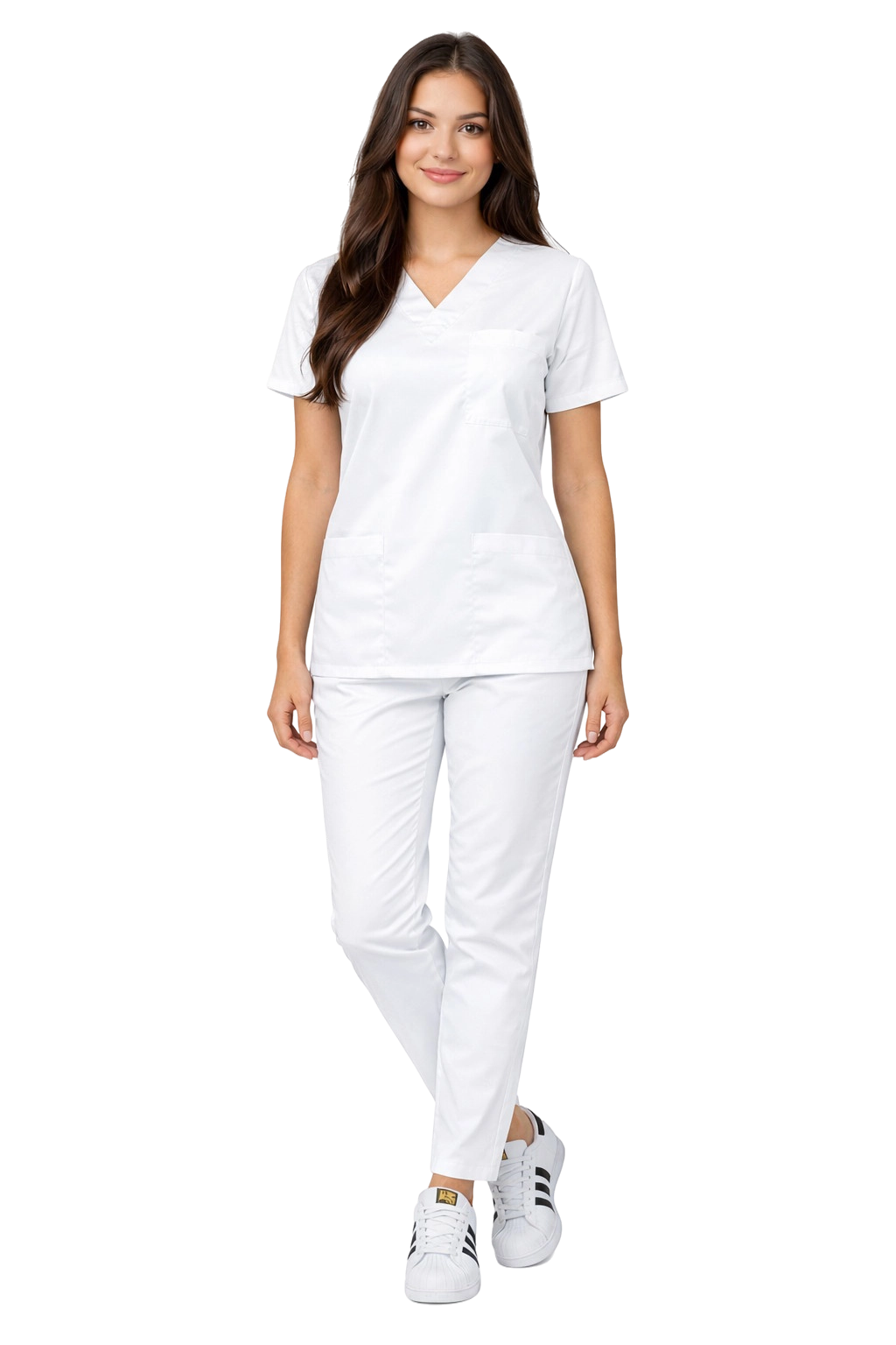 Elastīgs medicīnas komplekts balts COMFORT FLEX ir moderns uniformas komplekts, kas izstrādāts ar domu par sievietēm, kas strādā medicīnas nozarē, kuras novērtē komfortu, funkcionalitāti un elegantu izskatu. Komplekts ir izgatavots no augstas kvalitātes elastīga auduma, kas nodrošina brīvu kustību intensīvas darba dienas laikā ar pacientiem.