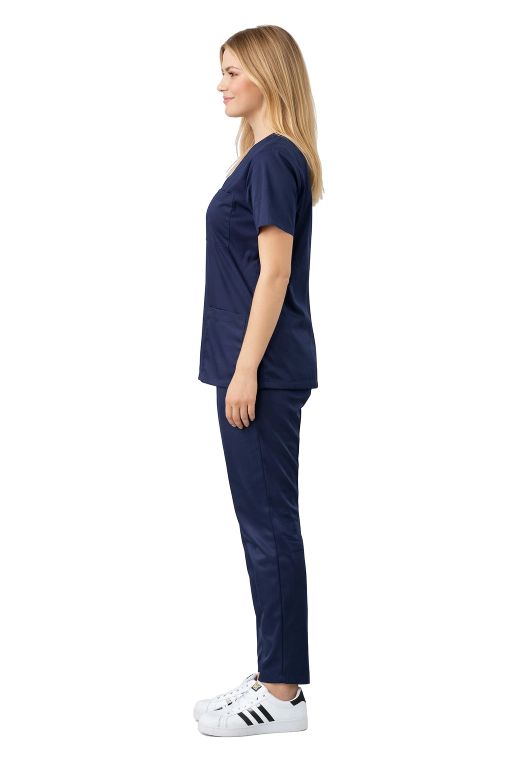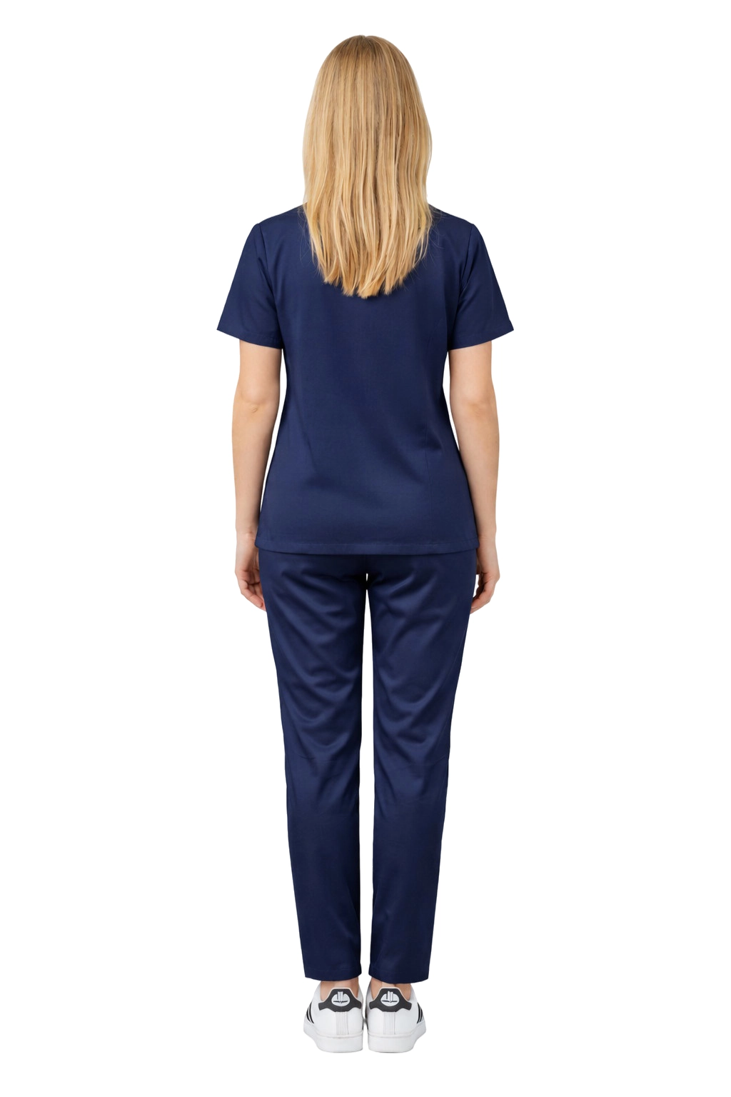 Elastīgs medicīnas komplekts COMFORT FLEX tumši zilā krāsā ir mūsdienīgs medicīnas formterps sievietēm, kas augstu vērtē ērtumu, eleganci un brīvību kustēties ilga darba diena ar pacientiem. Komplekts ir izgatavots no augstas kvalitātes elastīga auduma, kas nodrošina nēsāšanas ērtumu un ilgmūžību pat intensīvas lietošanas gadījumā.