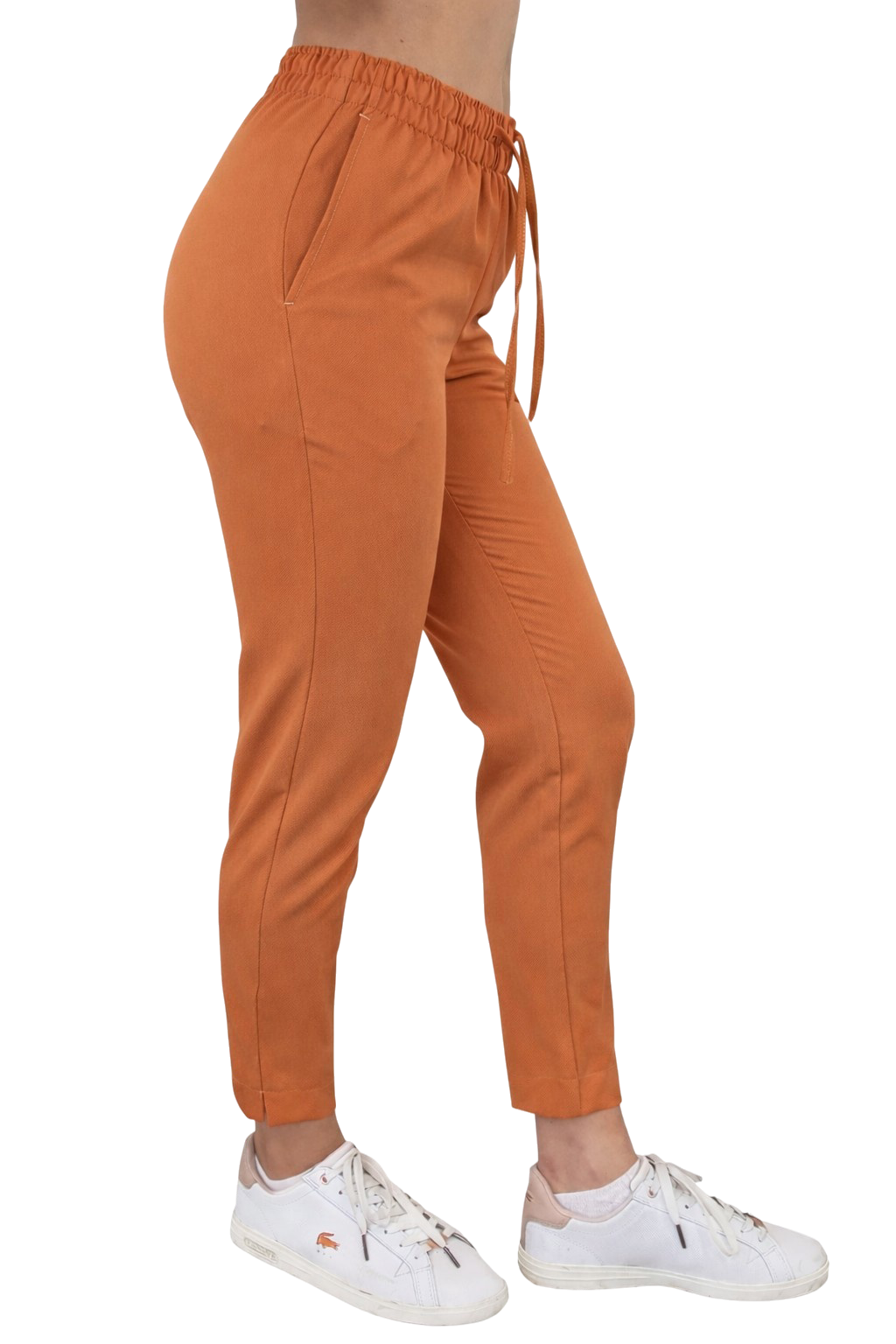 Bikses ir piegrieztas stila ar sašaurinātiem kājgaliem un elegantiem griezumiem. Divas praktiskas kabatas ļauj glabāt mazus priekšmetus, bet elastīga jostasvietas gumija un striķis nodrošina ideālu piestāvēšanu siluetam. Tas ir modelis, kas apvieno eleganci ar sportisku komfortu.