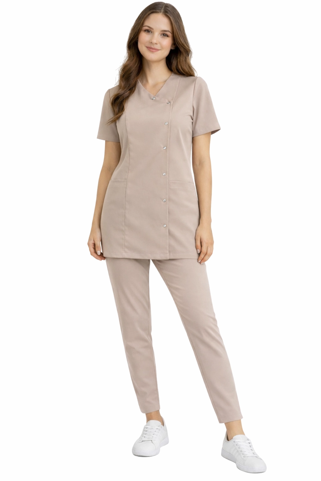 Medicīniskais / kosmētiskais sieviešu komplekts Basic Premium bēšā krāsā ir ideāls risinājums medicīnas un kosmētikas nozares profesionāļiem. Izgatavots no augstas kvalitātes materiāliem, nodrošina ērtu valkāšanu un estētisku izskatu. Pateicoties rūpīgai drēbju šūšanai, komplekts lieliski piestāv figūrai, un tā krāsu palete veicina tīrības un elegances uzturēšanu. Izvēlieties Basic Premium un uzsveriet savu profesionālismu un stilu darbā.