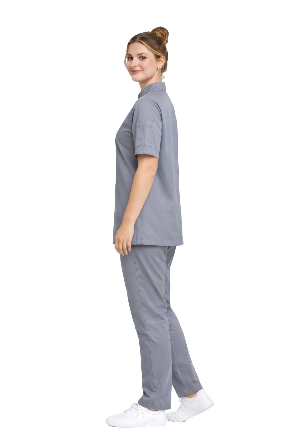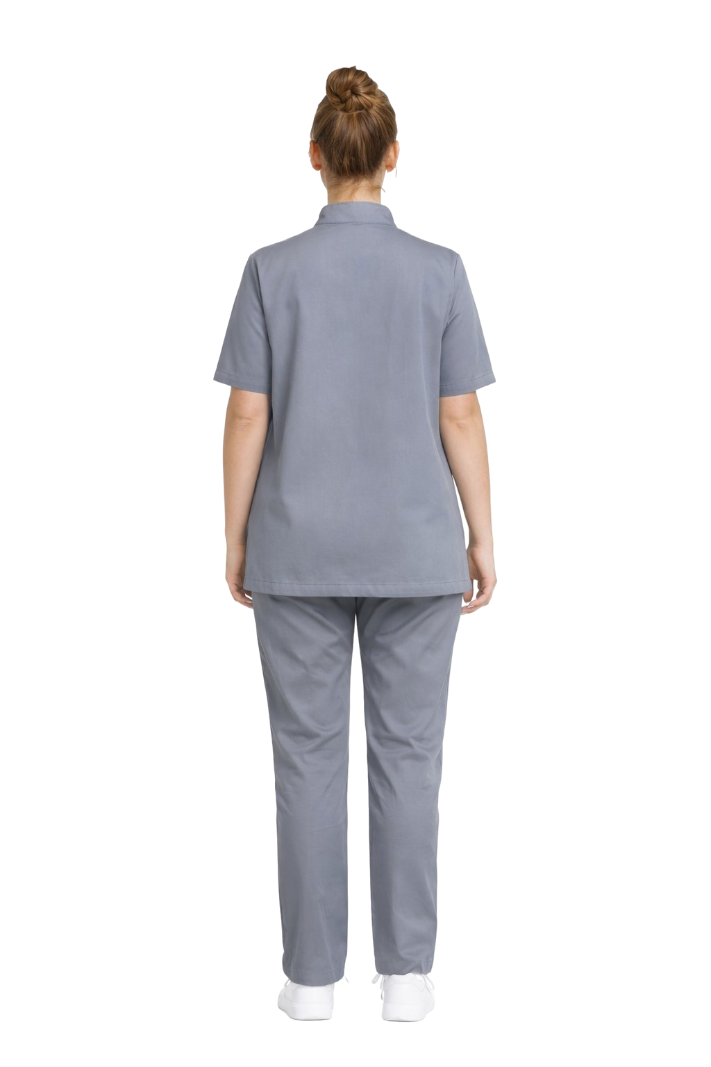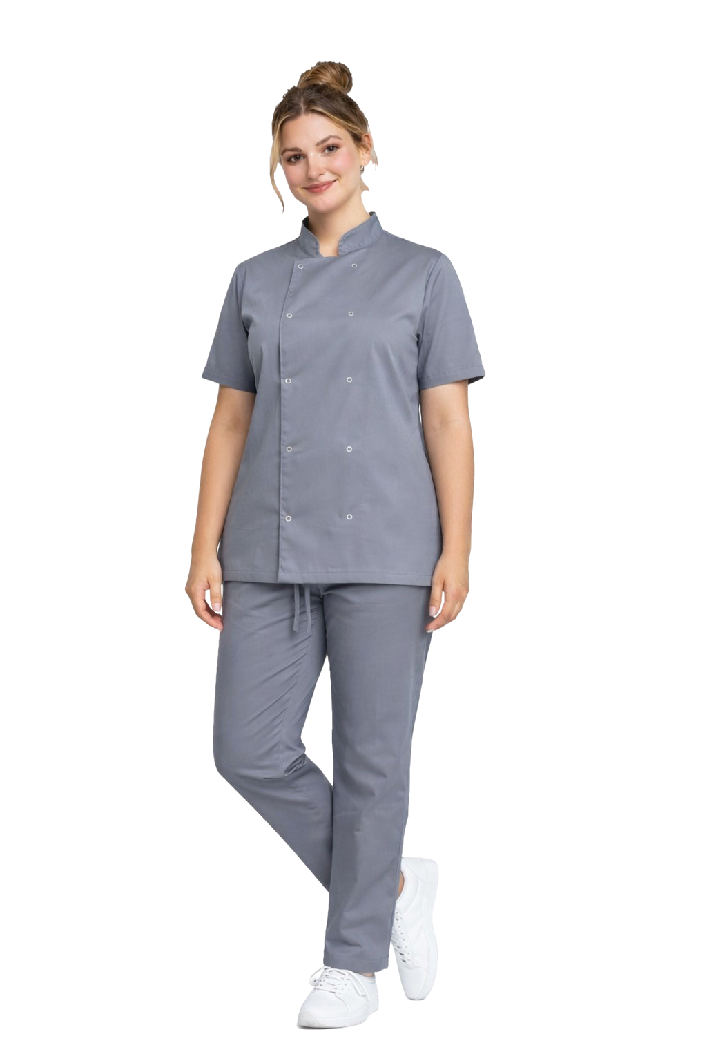 Pateicoties elastāna auduma izmantošanai, komplekts nodrošina augstu darba komfortu, estētisku izskatu un pilnīgu kustību brīvību. Piestāvējošais blūzes griezums un ērtas bikses nodrošina, ka komplekts ideāli piemērojas sieviešu siluetam un atbalsta profesionālu tēlu darba vietā.